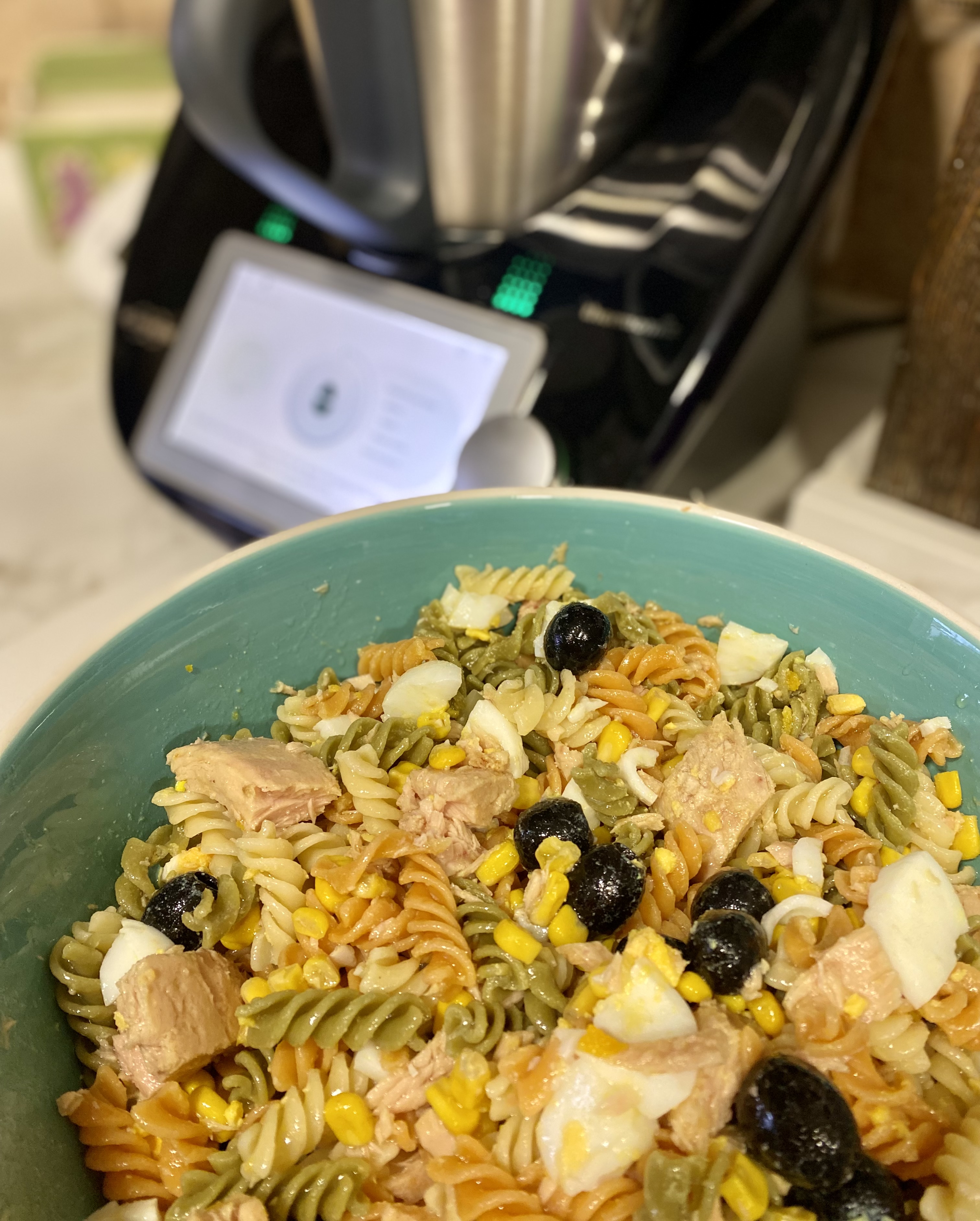 Hoy os quiero presentar una riquísima ensalada de pasta, utilizando dos modos de nuestro Thermomix: Modo Hervidor y Modo Cocción de Huevos.