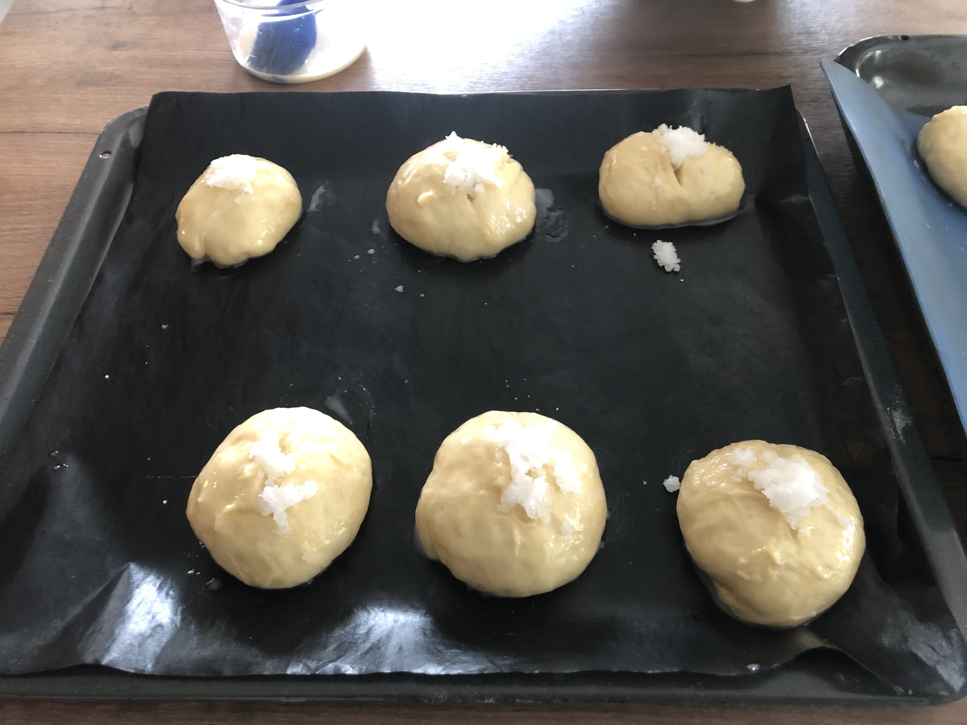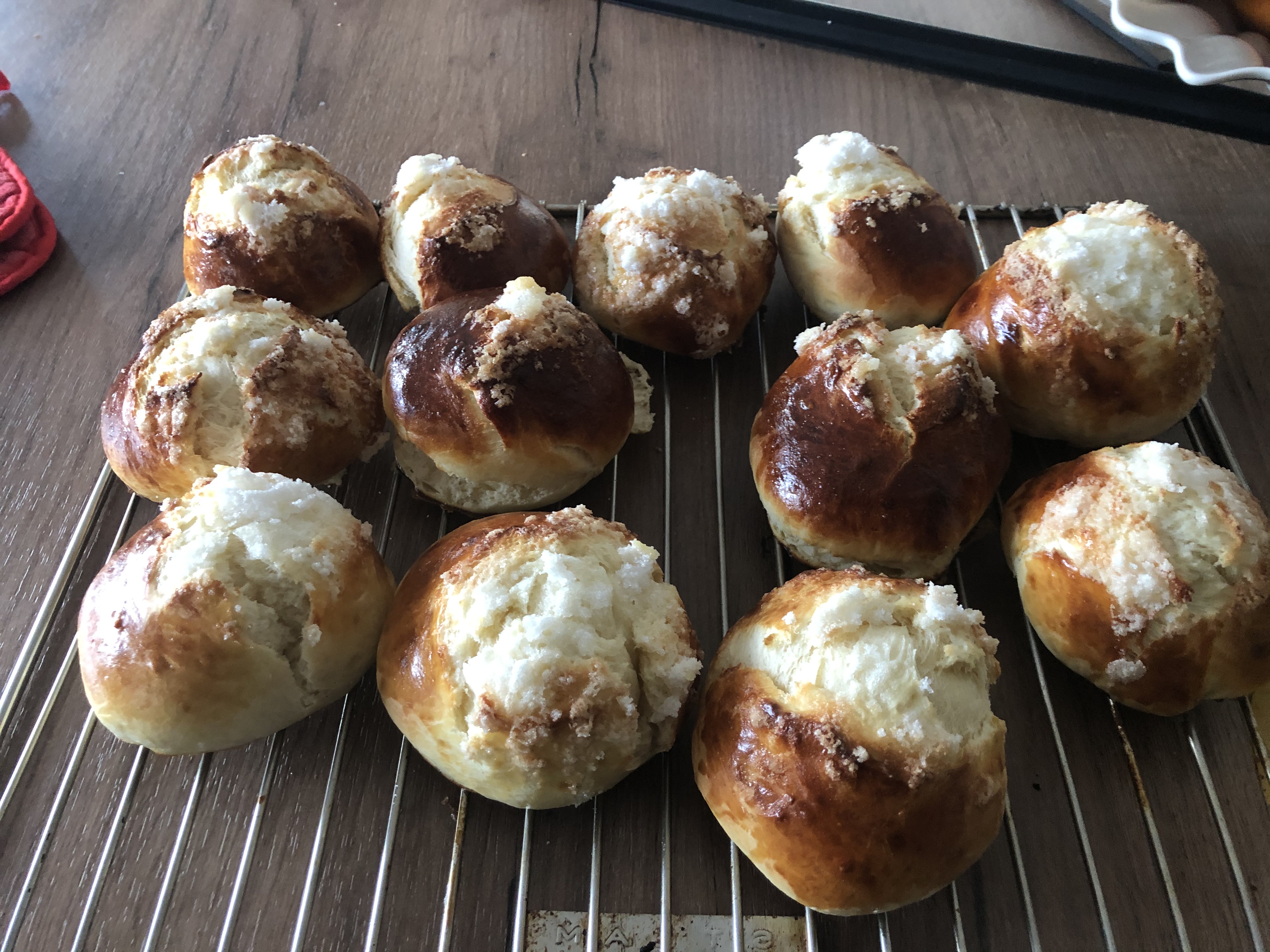 Cuando los bollos hayan doblado su volumen, les pintamos de nuevo con el huevo batido, hacemos un corte a lo largo y ponemos el azúcar humedecido a lo largo del corte. Horneamos en 2 tandas durante 7 minutos (240°C). Retiramos del horno, dejamos templar y listos!!