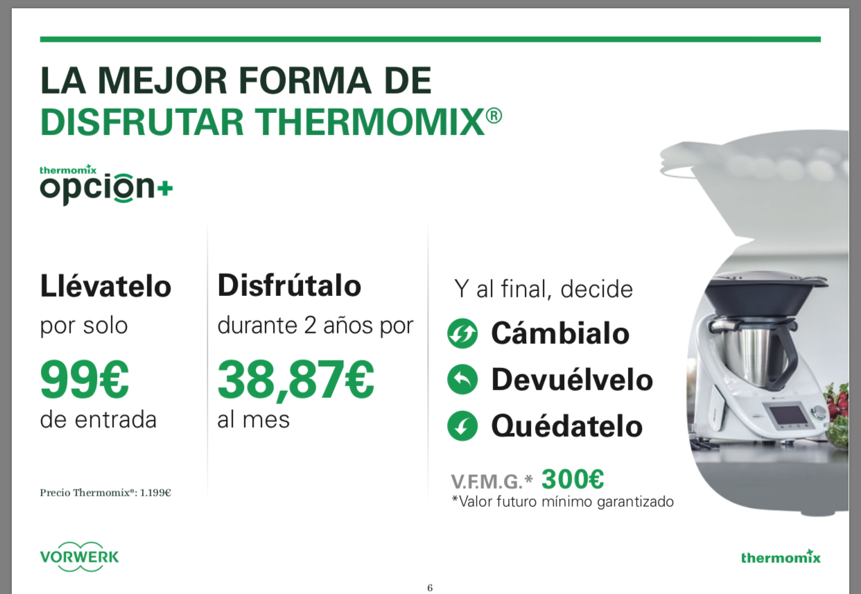 Y, SEGURO, finaliza en un periodo de opciones: CAMBIA, DEVUELVE o QUÉDATELA , por un valor mínimo garantizado y compromiso de recompra por parte de vorwerk por 300€