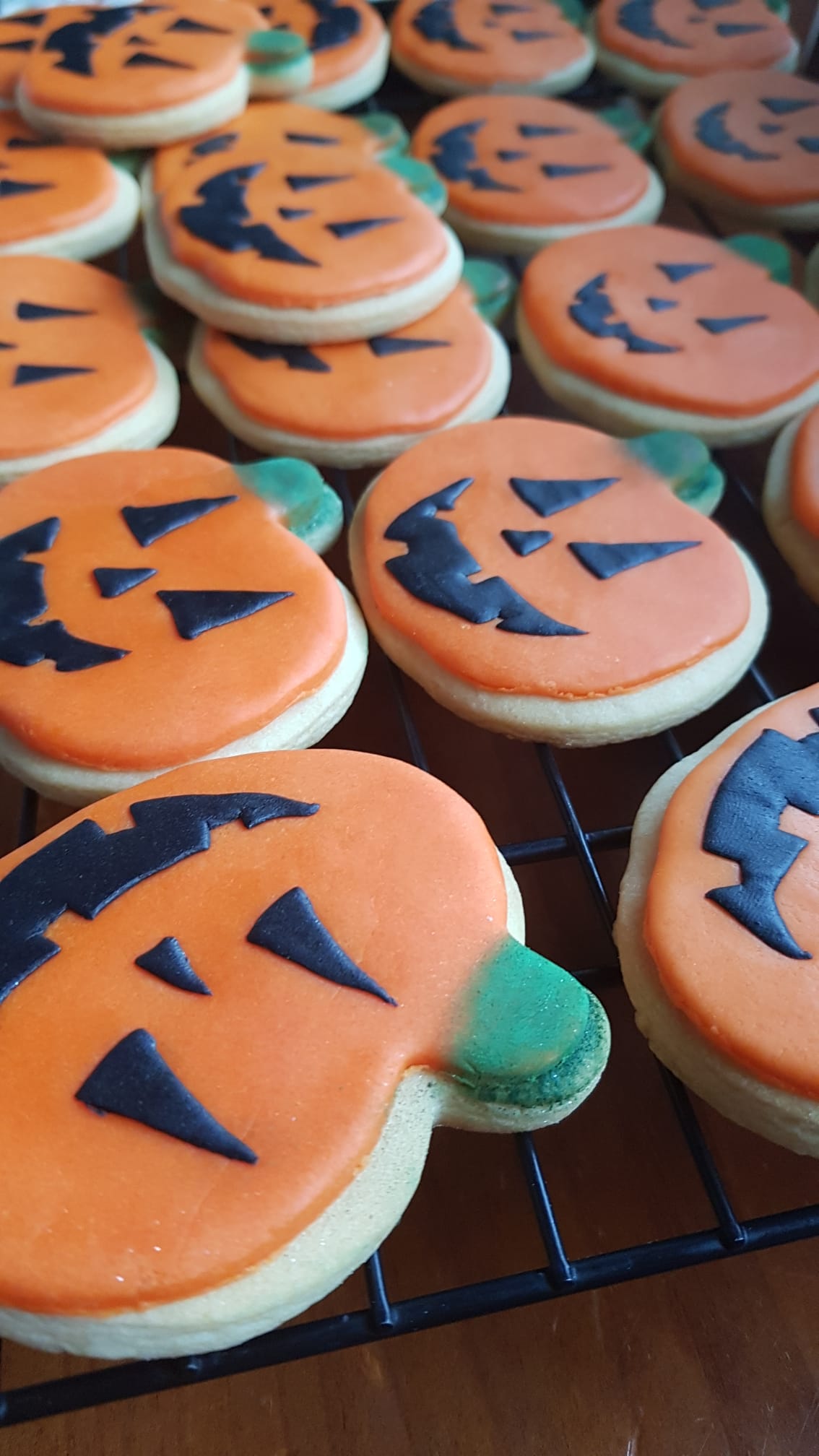 Mis hijas hicieron estas preciosas calabazas simplemente con fondant naranja y negro y luego colorante en polvo verde para hacer el rabito.