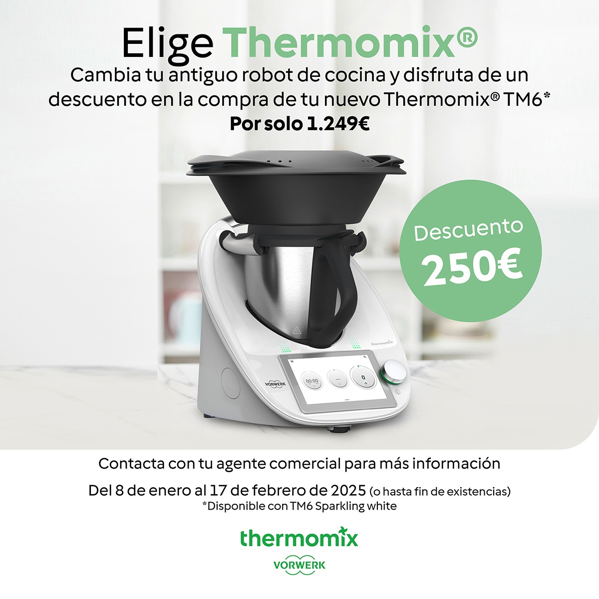 Y como bien puedes leer, puedes cambiar tu antiguo robot de cocina y tener un descuento de 250€ en tu nuevo TM6 de Thermomix®