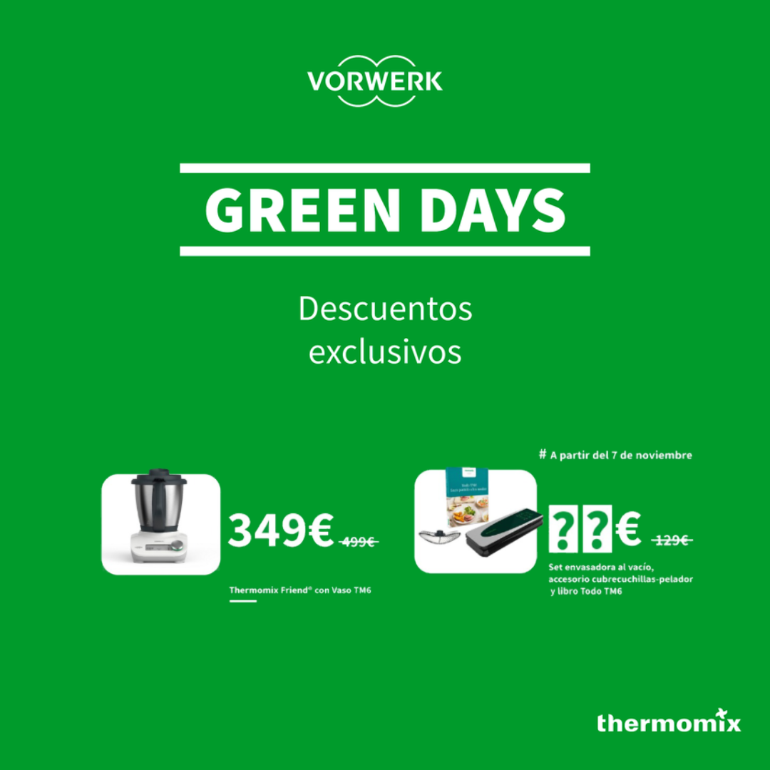 Este 2022 en Vorwerk queremos adelantarnos al Black Friday para traerte los Green Days, con descuentos increibles en una selección de nuestros mejores productos Thermomix®. Beneficiate de los Green Days adquiriendo el Thermomix Friend o la envasadora al vacío.