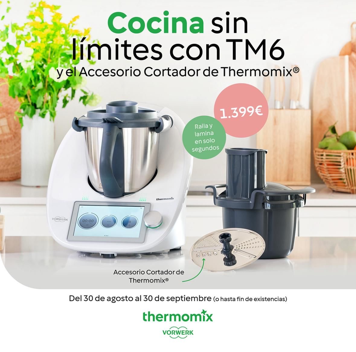 Sólo hasta el 30/9 Cocina Sin Límites con el Thermomix y el Accesorio Cortador por 1399€ (ahorro de 200€)!! Llama para más info, una demostración o para adquirir tu Thermomix.