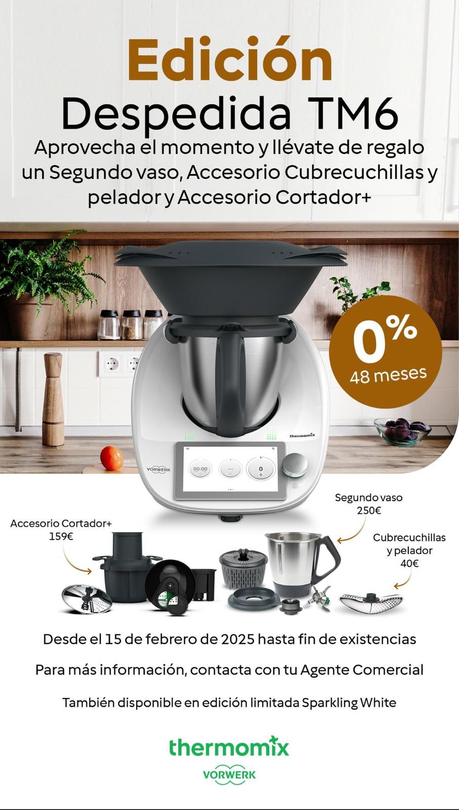Si quieres tener un Thermomix espectacular con muchos modos que te facilitan y que te aportan nuevas ideas al cocinar, y además a un precio INCREÁBLE, tenemos la EDICIÓN DESPEDIDA TM6 que incluye el Th6, 2o vaso completo, Accesorio cortador y espirilizador y cubrecuchillas/pelador sólo x 1499€ y puedes pagarlo además hasta en 48 meses SIN INTERESES (Ahorro 450€)