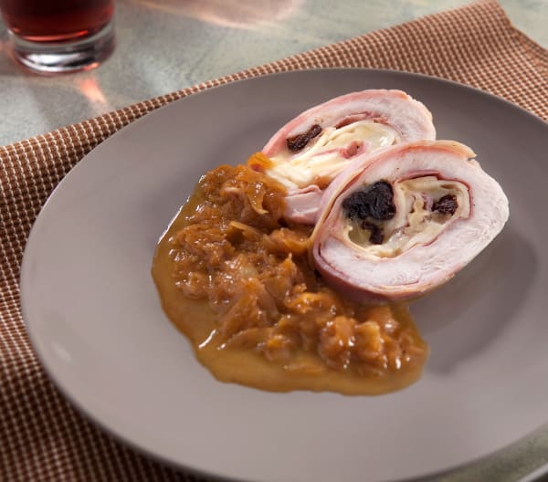 Una vez templado el rollo de pavo, retire el film transparente, corte en rodajas y sirva con la cebolla caramelizada.