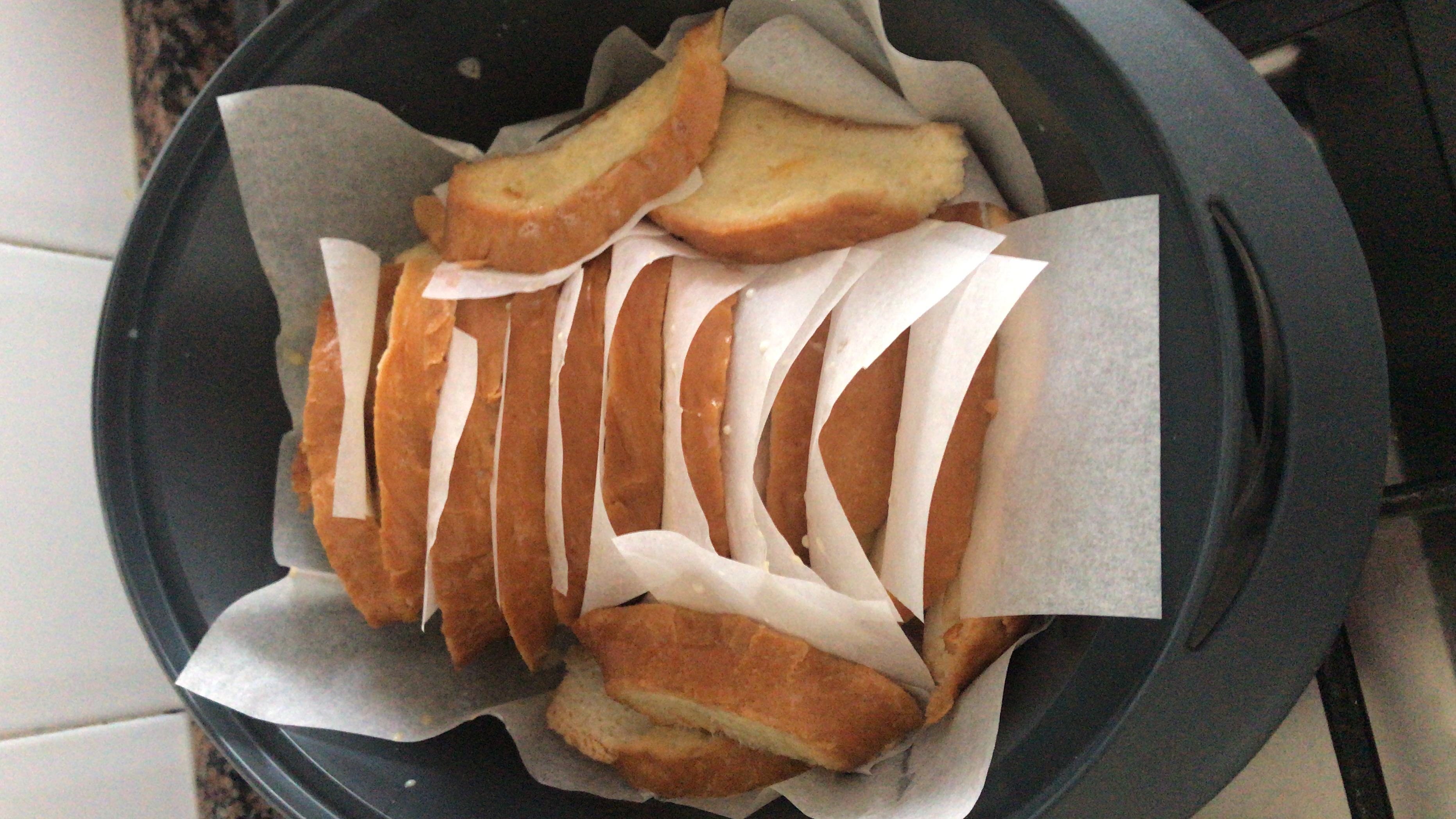 4/ introducir las rodajas de pan primero en la leche y luego en el huevo batido y ir colocando en el varoma de 1 en 1 en batería (como en la foto ) y un trozo de papel vegetal como separación tapar el varoma y reservar