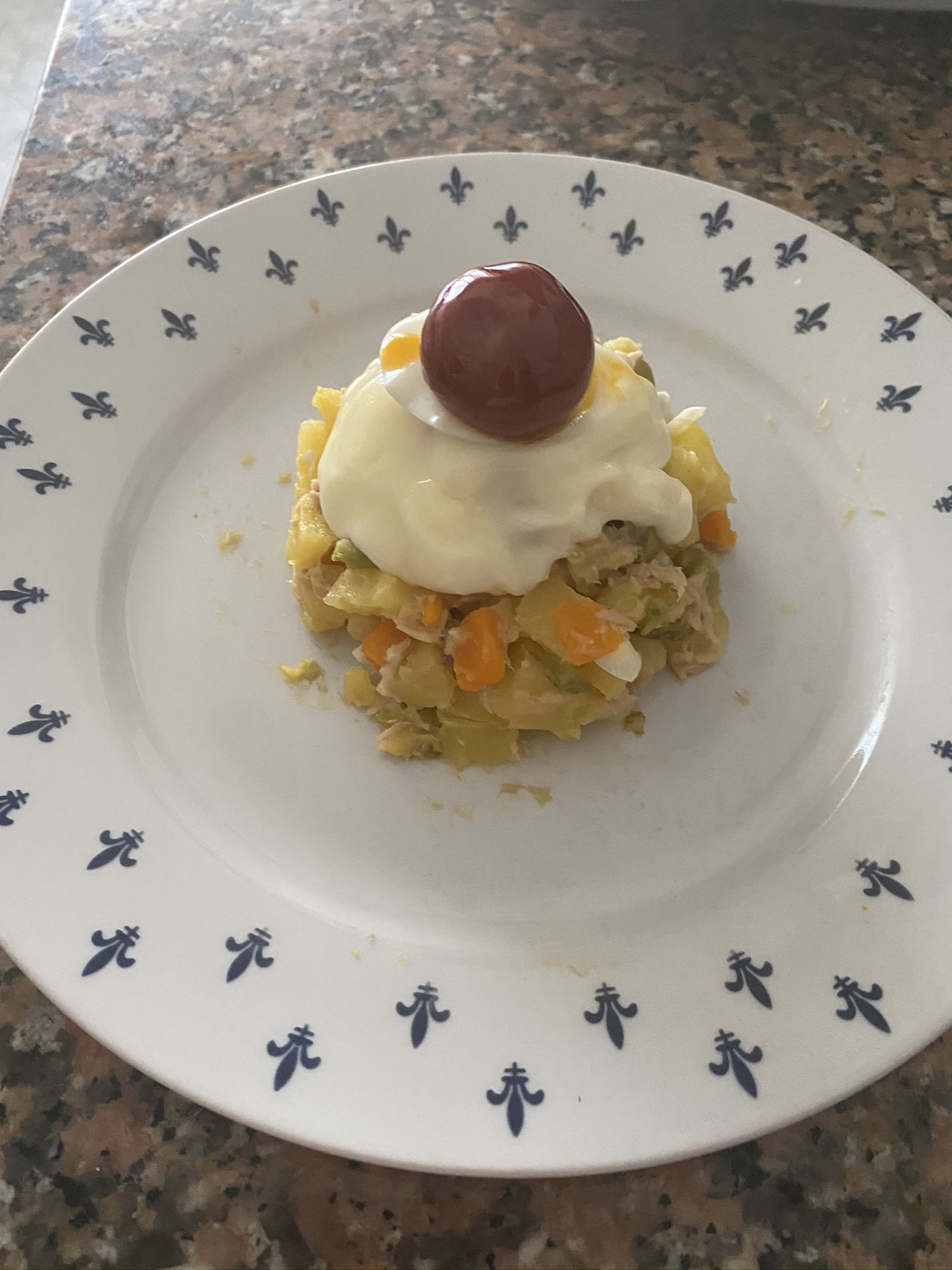Vierta la mayonesa en la ensaladera con las patatas y las zanahorias ya frías, el atún y los huevos y mezcle. Guarde la ensaladilla rusa en el frigorífico hasta el momento de servir.
