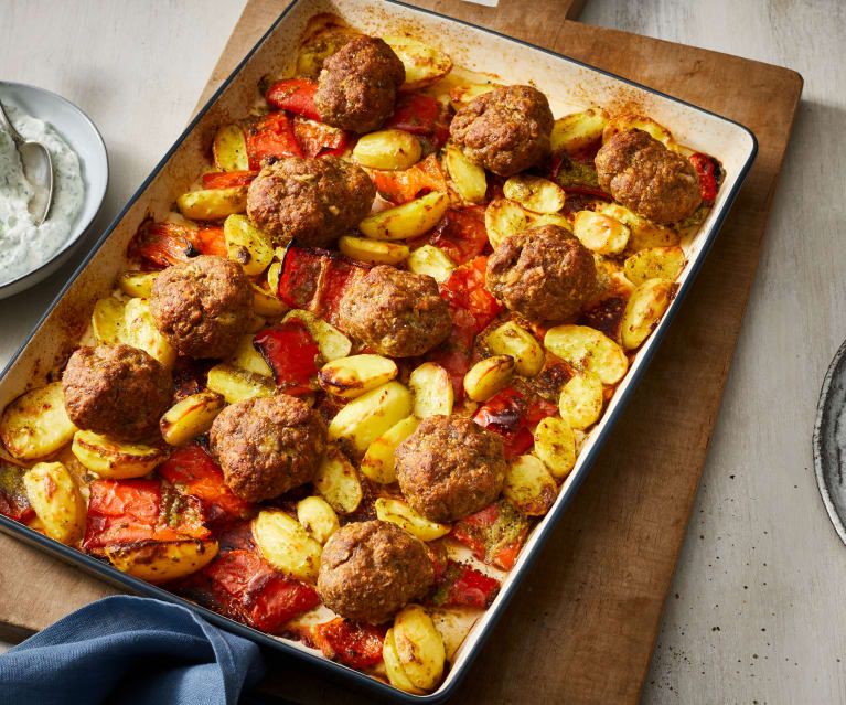 - Divida la mezcla de carne en 12 porciones de aprox. 60 g cada una. Forme 12 albóndigas y póngalas en la bandeja de horno "Ben" entre las patatas y el pimiento.