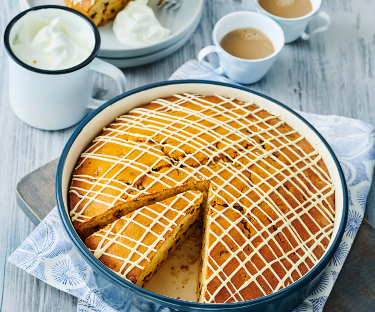 - Ponga en el vaso el chocolate blanco y ralle 6 seg/vel 6. Con la espátula, baje el chocolate hacia el fondo del vaso y funda 5 min/50°C/vel 2. Vierta el chocolate fundido en una manga pastelera y decore con hilos finos de chocolate formando una cuadrícula la superficie del bizcocho. Deje enfriar y sirva.